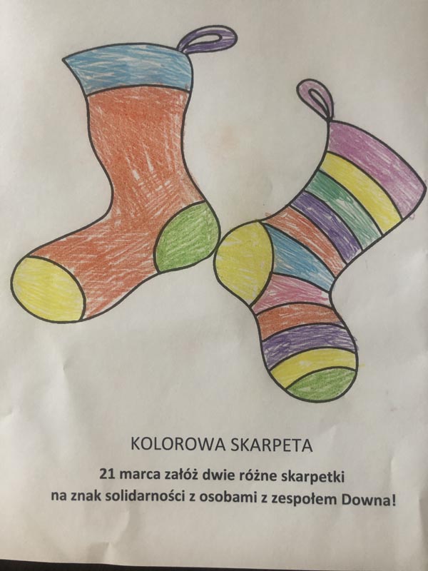 Z okazji Światowego Dnia Zespołu Downa, zachęcam wszystkich, aby ubrać kolorowe skarpetki, skarpetki nie do pary, które symbolizują dodatkowy, niepasujący chromosom. W ten sposób możecie pokazać, że inność Wam nie przeszkadza i w pełni ją akceptujecie. Skarpety nie do pary pokazują, że nie trzeba idealnie pasować, żeby być szczęśliwym. Ma się to również przyczyniać do zwiększena świadomości społeczeństwa na temat zespołu Downa. Pamiętajcie, że osoby z zespołem Downa różnią się jak te dwie różne skarpetki. Jednak są to wspaniałe osoby, które chcą mieć przyjaciół, tak jak WY, chcą kochać i być kochane, chcą się uczyć i pracować tak jak WY. Jednak przychodzi im to o wiele trudniej.