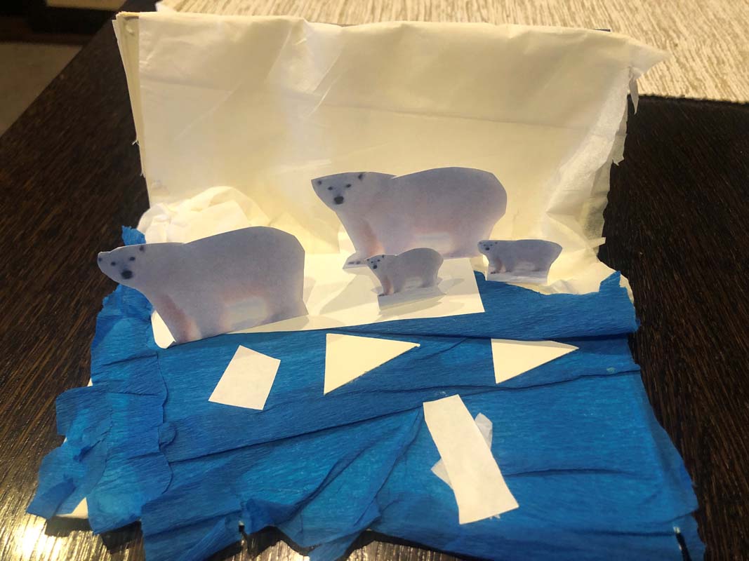 Wykonałem nawet dwie prace. Najpierw stworzyłem makietę Antarktydy na której żyją pingwiny ( no może nie sam, trochę potrzebowałem pomocy). Tak bardzo się zaangażowałem, że chciałem się jeszcze bawić, wiec już prawie samodzielnie wykonałem kolejną pracę. Tym razem Arktykę i żyjące tam niedźwiedzie polarne.